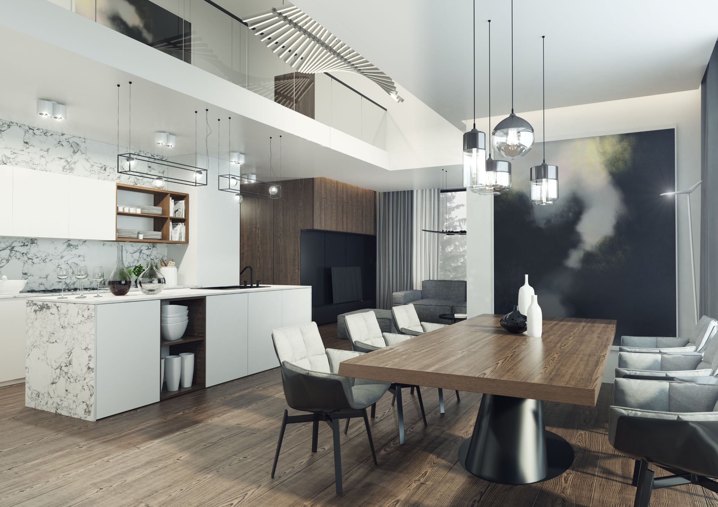 Kuchnia otwarta na salon czy jadalnię pozwala na to, by naturalne światło z obu pomieszczeń mogło swobodnie docierać w każdy zakątek. Taka aranżacja daje możliwość uzupełnienia wnętrza o odpowiednio dobrane lampy. W tym wypadku zabawa światłem jest jeszcze ciekawsza. Można np. stosować takie same lampy, ale z innym natężeniem światła. To pozwoli stworzyć unikalny klimat dla salonu i kuchni.